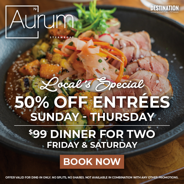 Aurum Food & Wine Steamboat offers seasonal new American cuisine served in a refined yet relaxed atmosphere featuring riverfront outdoor dining, outdoor rooftop patio dining, a large bar, a dining room, and spacious deck seating.